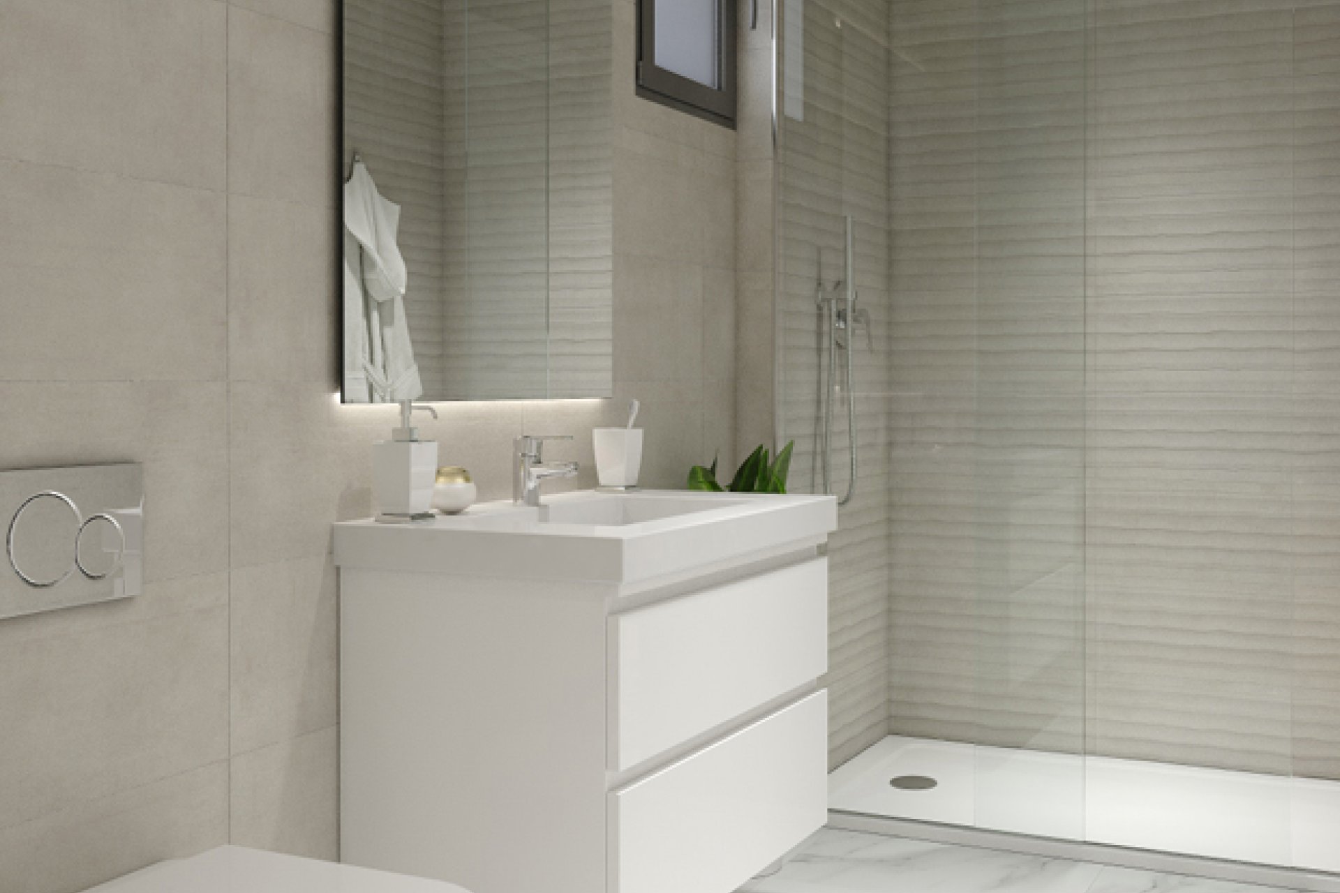 Los interiores cuentan con altas calidades: carpintería de PVC con doble acristalamiento y persianas térmicas, suelo porcelánico en toda la vivienda y falsos techos con aislamiento acústico. Las cocinas se entregan amuebladas y preparadas para electrodomésticos, con muebles hasta el techo, encimera de cuarzo e iluminación LED. Los baños disponen de muebles suspendidos, mamparas de ducha de vidrio de seguridad y suelo radiante eléctrico.